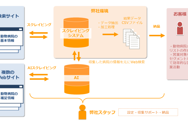 他社サイトでの求人票を手間をかけずに調査・分関をするため、WEBスクレイピングで複数サイトから情報収集。難しい正確な位置情報の取得や、ご希望のフォーマットへの加工などを行い、データを納品。それをもとに、お客様が参考サイトを作成し、サービスへの問い合わせが増えました。